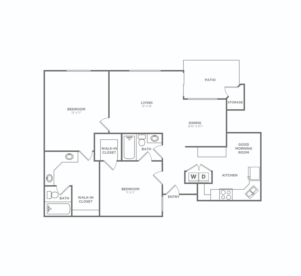 Modelo de apartamento: Two Bedroom Two Bath (1021 SF)Desde $1,8162 Dormitorios, 2 Baños, 1021 sq ftDisponible AhoraLos planos de la planta son una interpretación artística. Todas las dimensiones son aproximadas. Los tamaños o el detalle del producto real y sus especificaciones pueden variar. No todas las características están disponibles en todos los hogares para rentar. Los precios y la disponibilidad están sujetos a cambios. El alquiler que se muestra es mensual. Se pueden aplicar ciertos cargos, por ejemplo, entrega de paquetes, recolección de basura, agua, servicios, etc. Depositos varian. Consulta a un representante para conocer detalles.