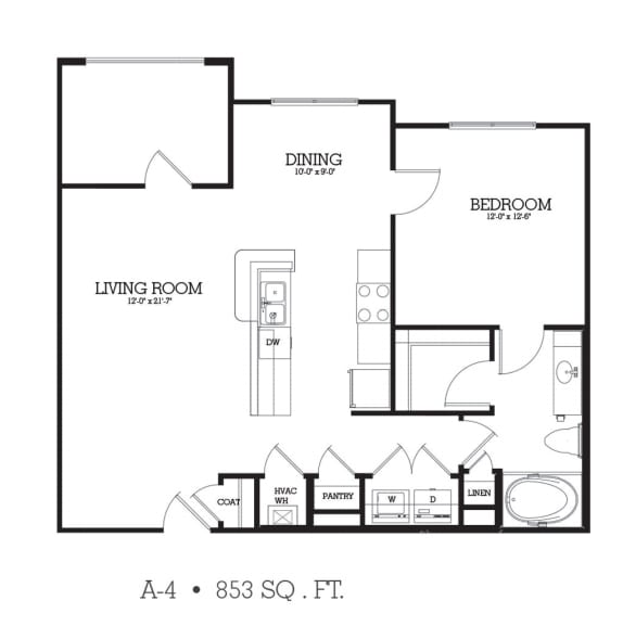 A4 (853 SF) - Plano 1 Los planos de la planta son una interpretación artística. Todas las dimensiones son aproximadas. Los tamaños o el detalle del producto real y sus especificaciones pueden variar. No todas las características están disponibles en todos los hogares para rentar. Los precios y la disponibilidad están sujetos a cambios. El alquiler que se muestra es mensual. Se pueden aplicar ciertos cargos, por ejemplo, entrega de paquetes, recolección de basura, agua, servicios, etc. Depositos varian. Consulta a un representante para conocer detalles.