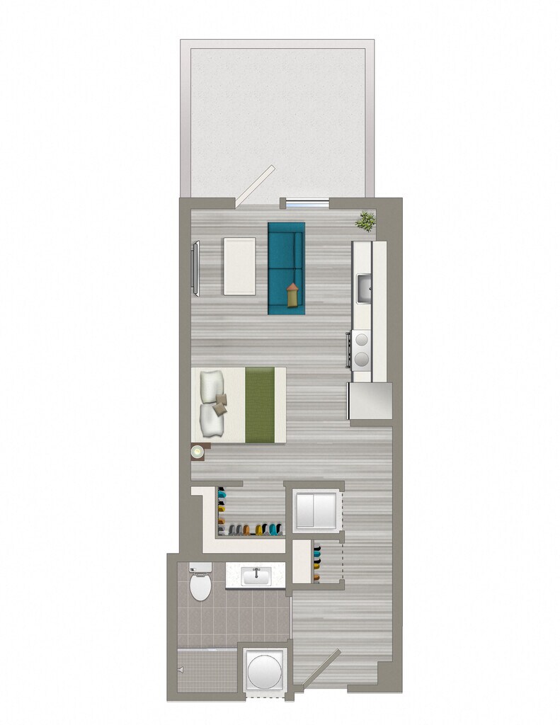 Studio-E - Plano 1 Unidad de apartamento: 764Modelo de apartamento: Studio-E$1,545Estudio, 1 Baño, 490 sq ftDisponible AhoraStudio-F