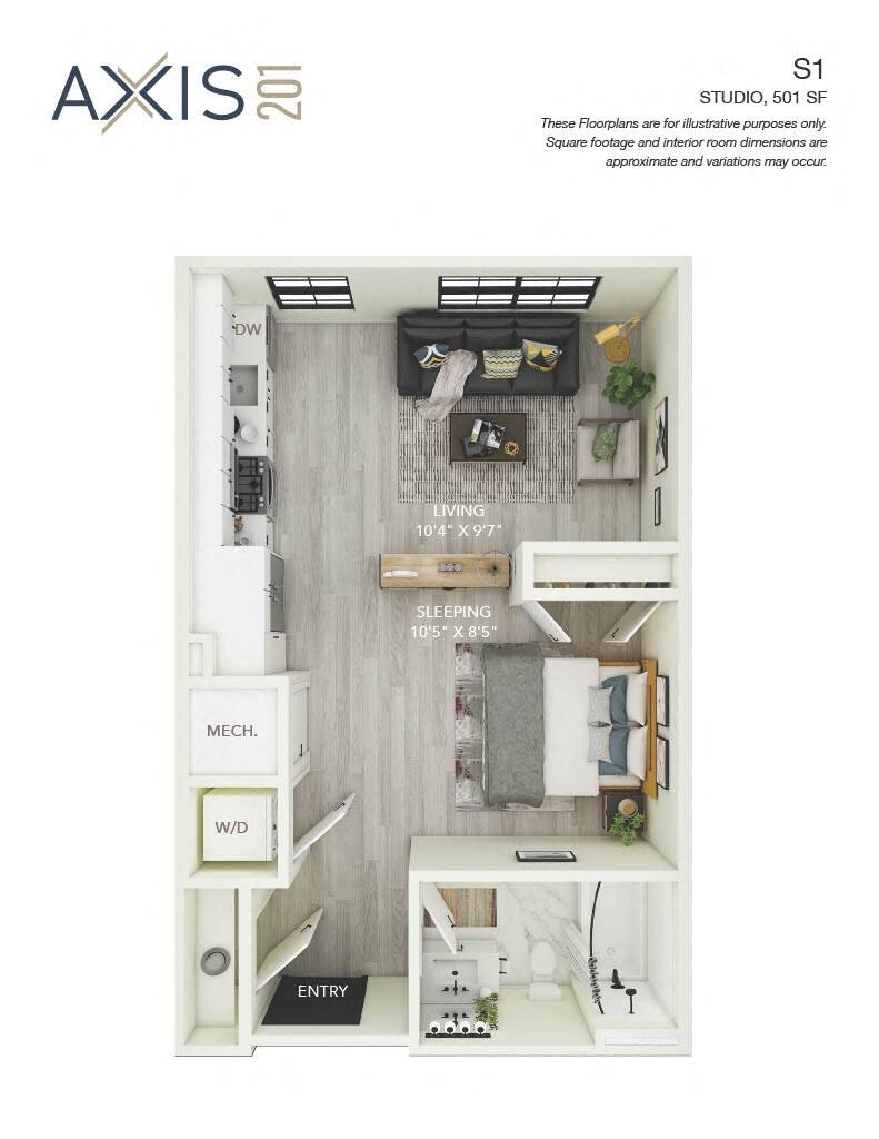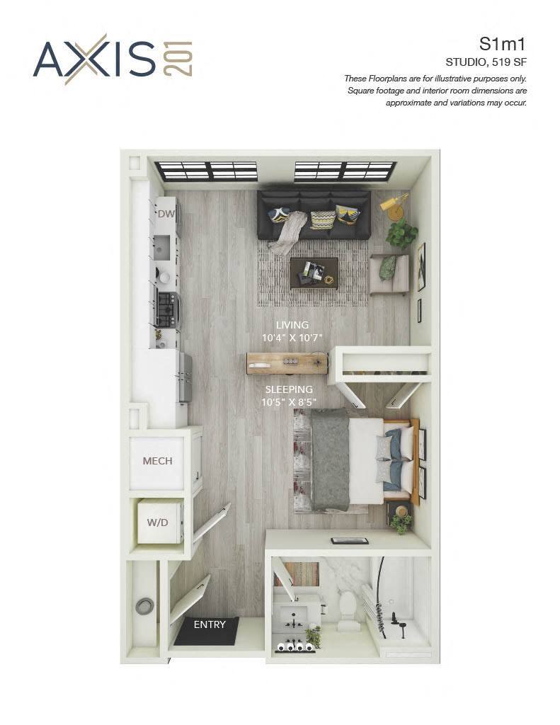 Axis 201 ofrece apartamentos de Estudio a 3 Dormitorios desde $1,762 con 333–1,550 pies cuadrados. Aquí está el precio actual y la disponibilidad:
