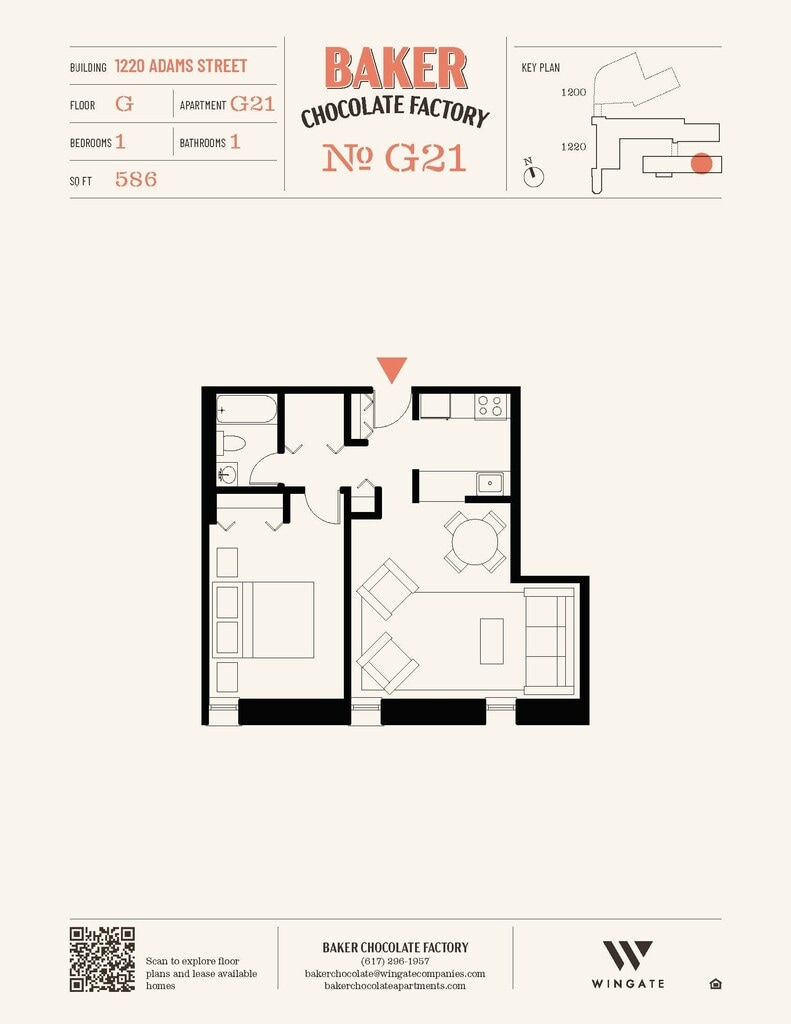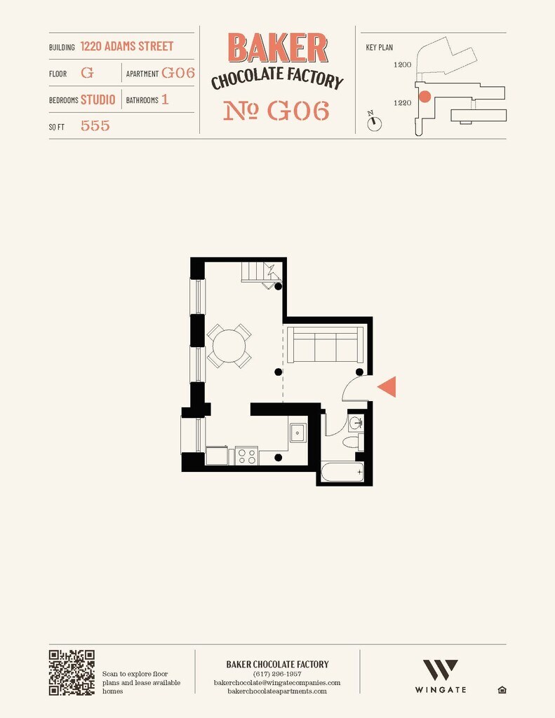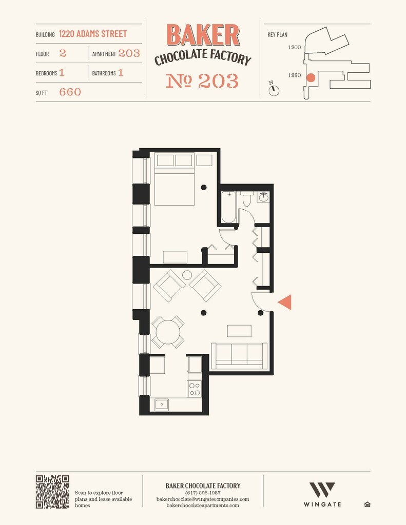 Baker Chocolate Factory ofrece apartamentos de Estudio a 2 Dormitorios desde $2,361 con 522–1,501 pies cuadrados. Aquí está el precio actual y la disponibilidad: