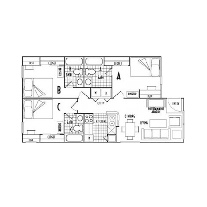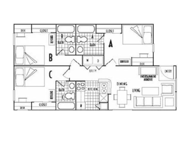 Modelo de apartamento: 3x3 UGDesde $6853 Dormitorios, 3 Baños, 988 sq ftDisponible Ahora![]()
