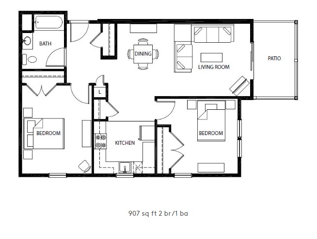 2 Dormitorios, 1 Baño, 907 pies²Galería del Modelo