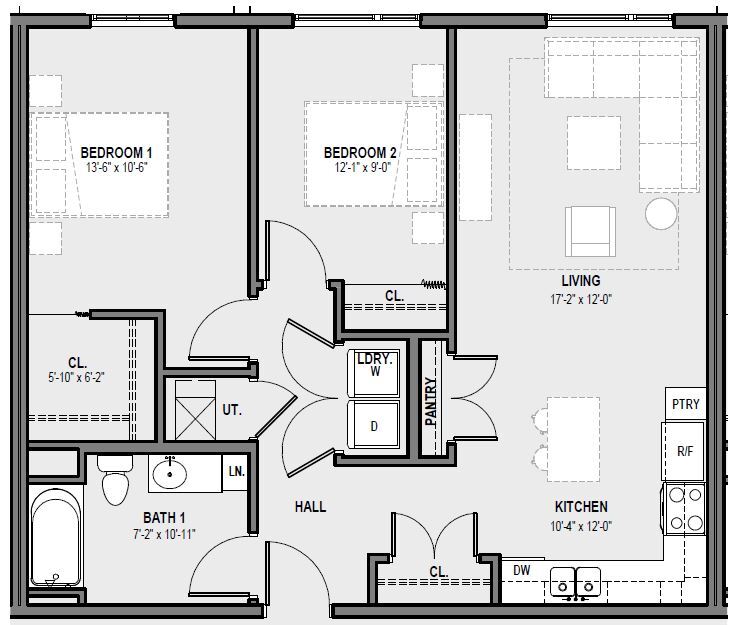 Modelo de apartamento: 2Bd/1BthDesde $9662 Dormitorios, 1 Baño, 987-997 sq ftNo Disponible![]()