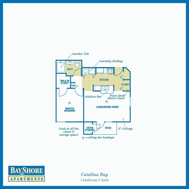 A Catalina Bay 1.1 Dn - Plano 1 Unidad de apartamento: 1578BModelo de apartamento: A Catalina Bay 1.1 Dn1 Dormitorio, 1 Baño, 688 sq ftDisponible AhoraB Monterey Bay 1.1 Up