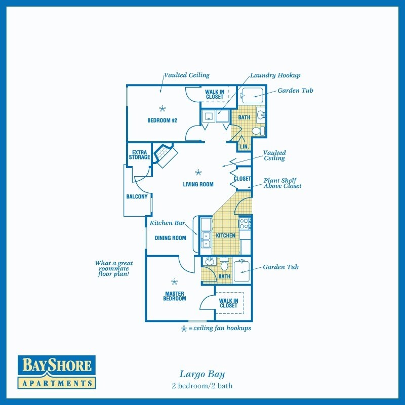 I Largo Bay 2.2 Up - Plano 1 Unidad de apartamento: 1424CModelo de apartamento: I Largo Bay 2.2 Up2 Dormitorios, 2 Baños, 946 sq ftDisponible AhoraE Chesapeake Bay 2.1 Dn