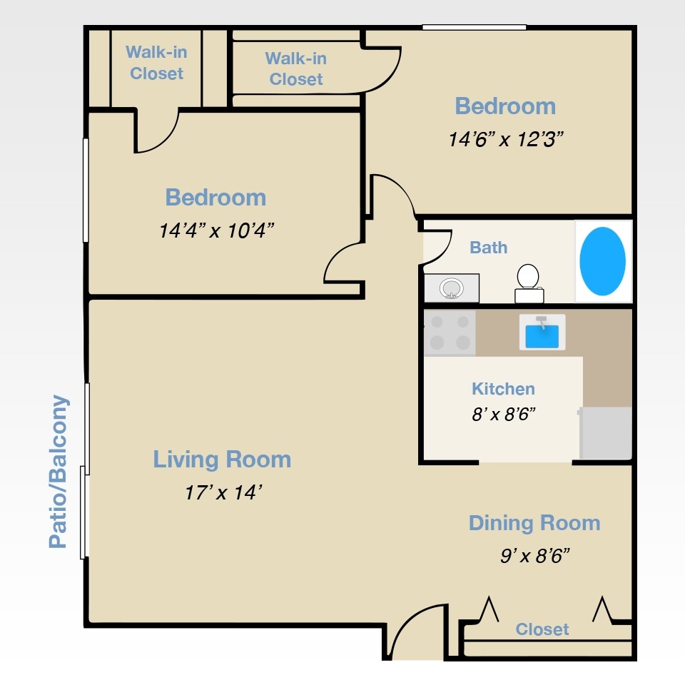 2 Dormitorios, 1 Baño, 886 pies²Disponible AhoraGalería del Modelo
