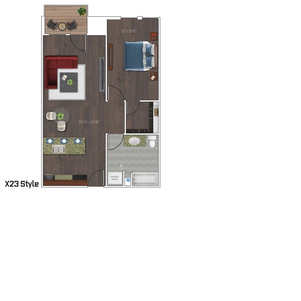 Modelo de apartamento: X23Desde $1,5001 Dormitorio, 1 Baño, 720 sq ftNo DisponibleX23 - Imagen 1 Plano: X25