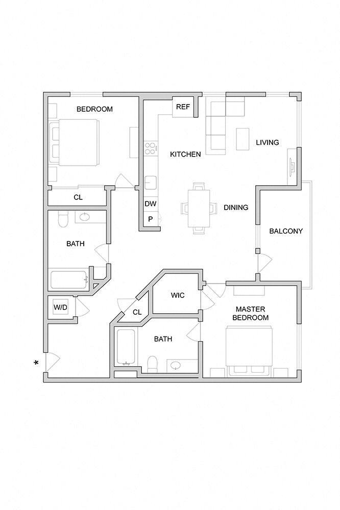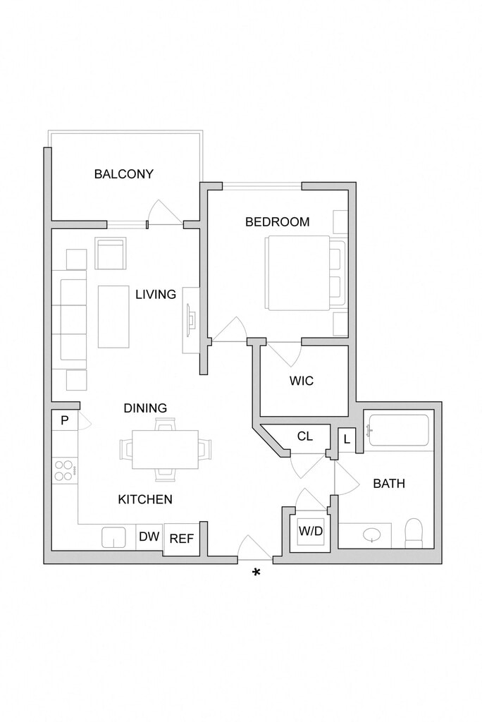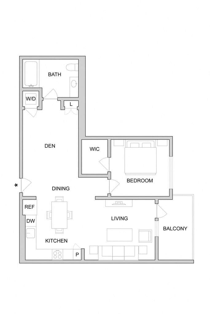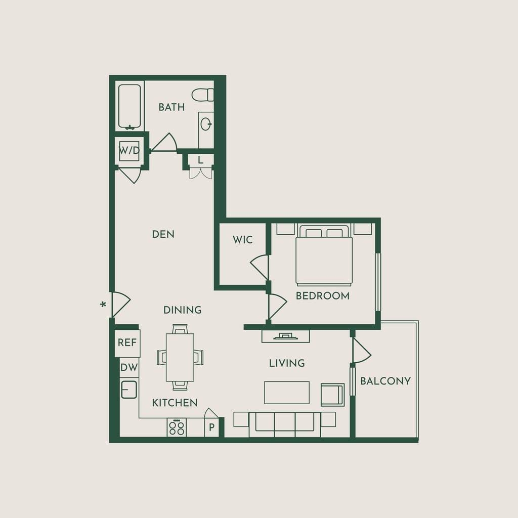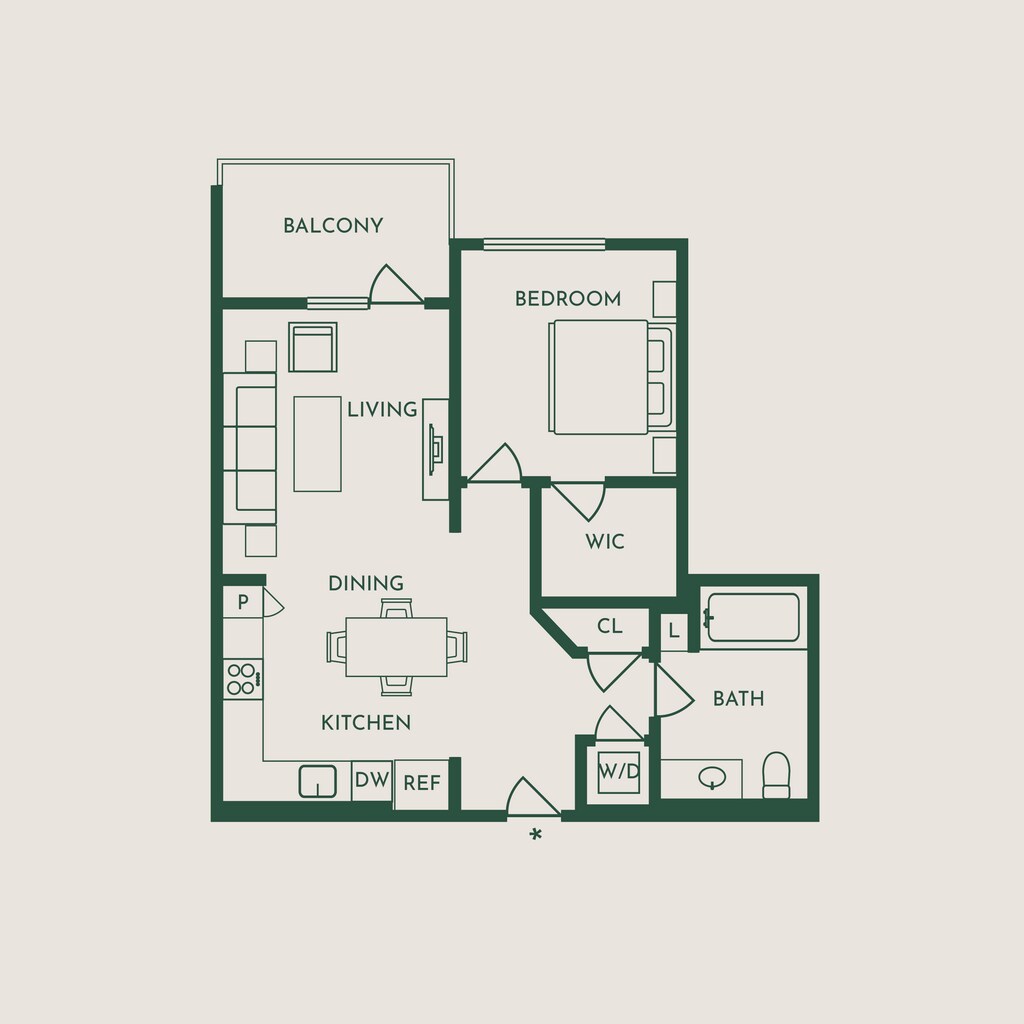 Modelo de apartamento: A1Desde $2,5041 Dormitorio, 1 Baño, 703 sq ftDisponible Ahora![]()