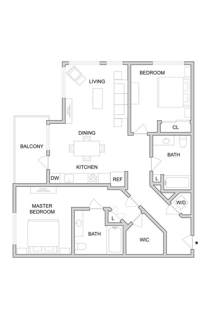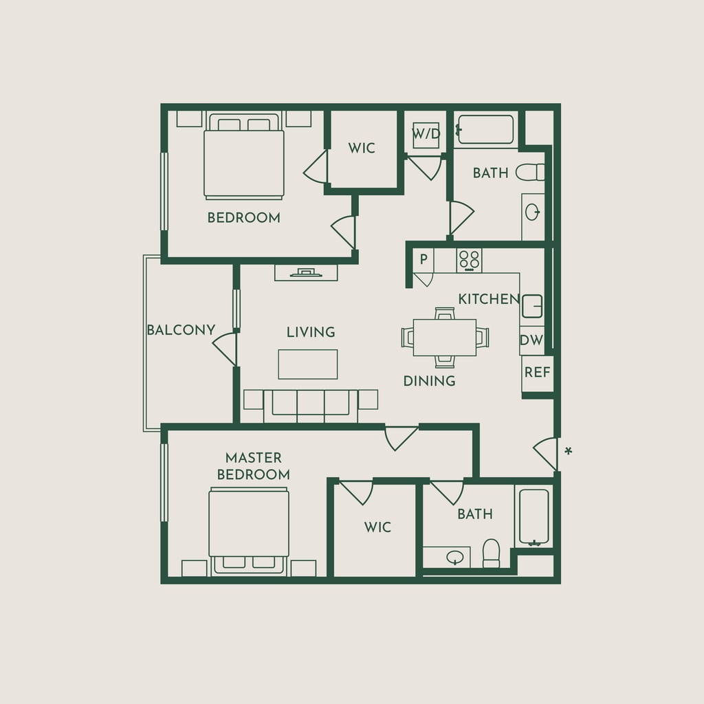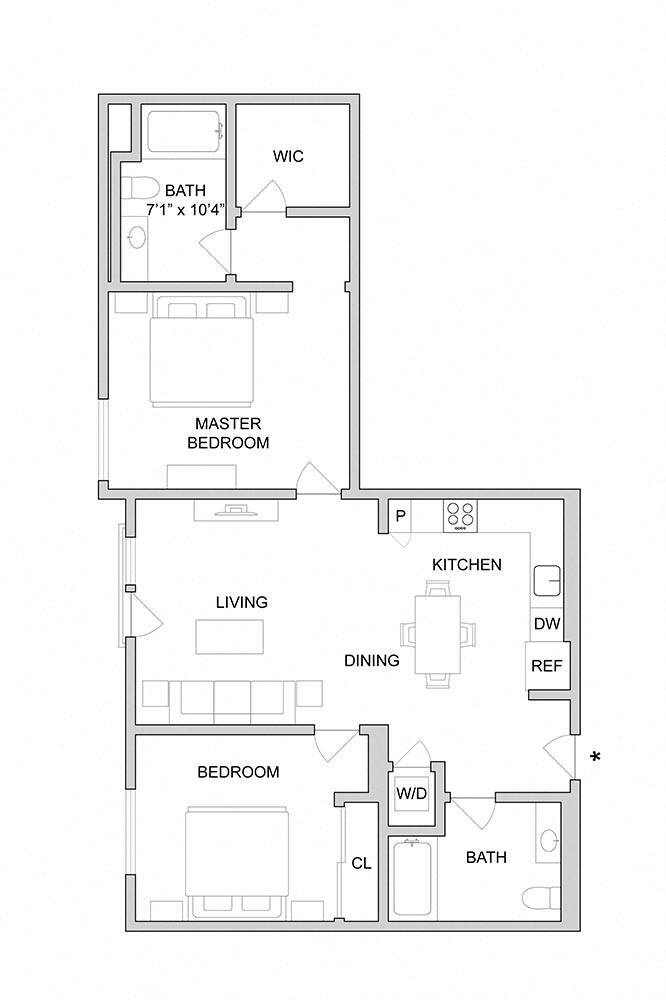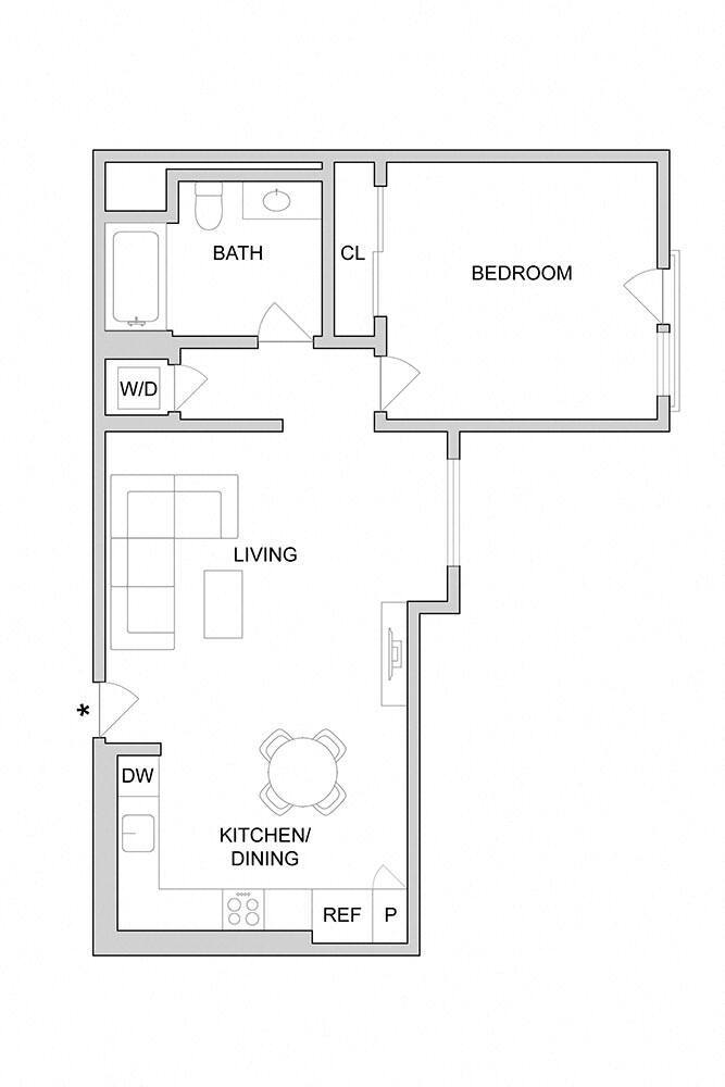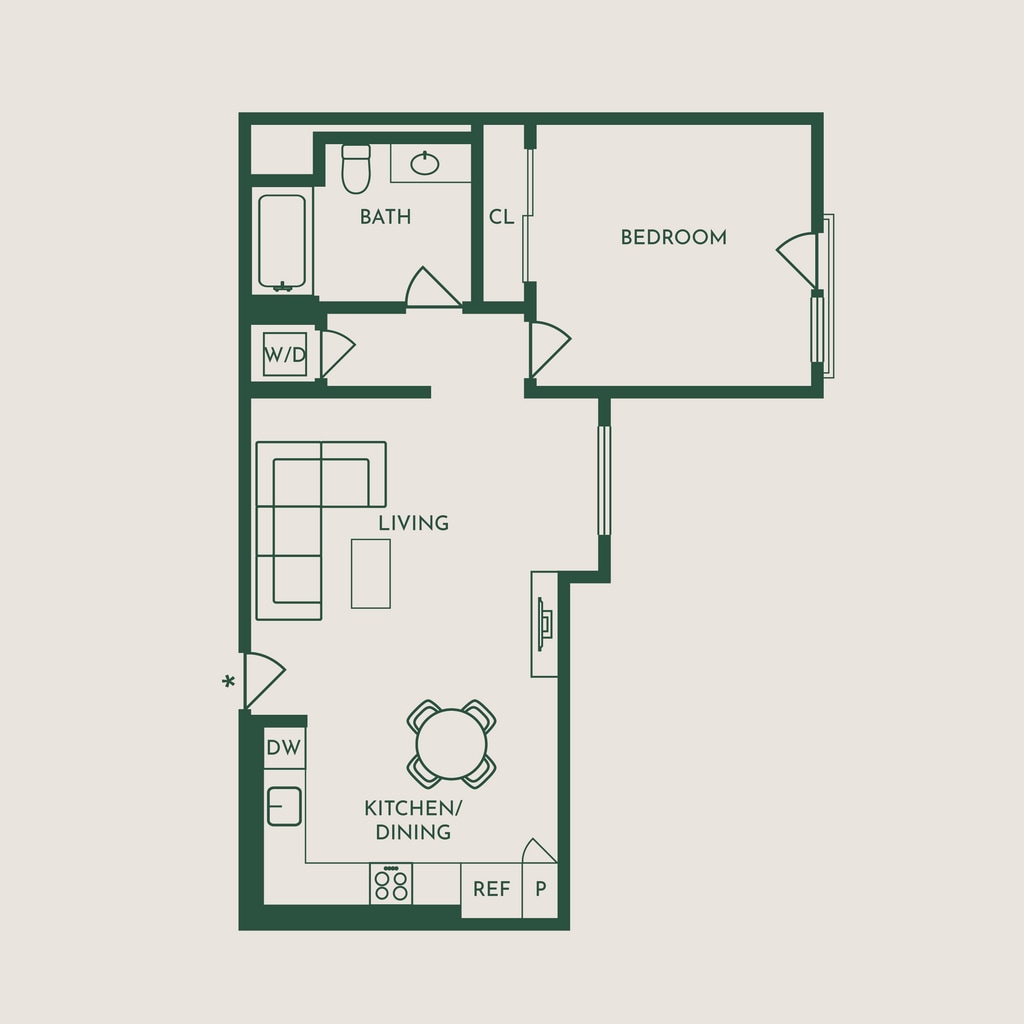 Modelo de apartamento: A1Desde $2,5041 Dormitorio, 1 Baño, 703 sq ftDisponible Ahora![]()
