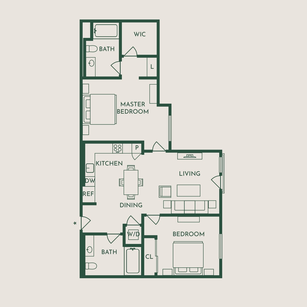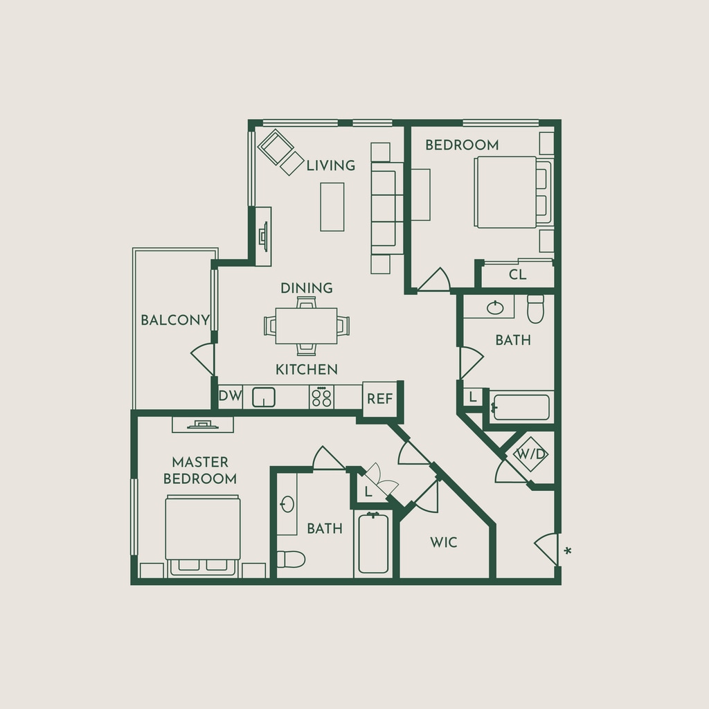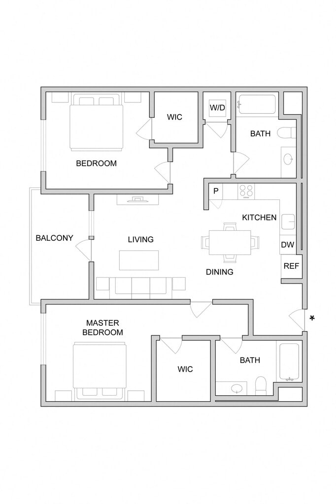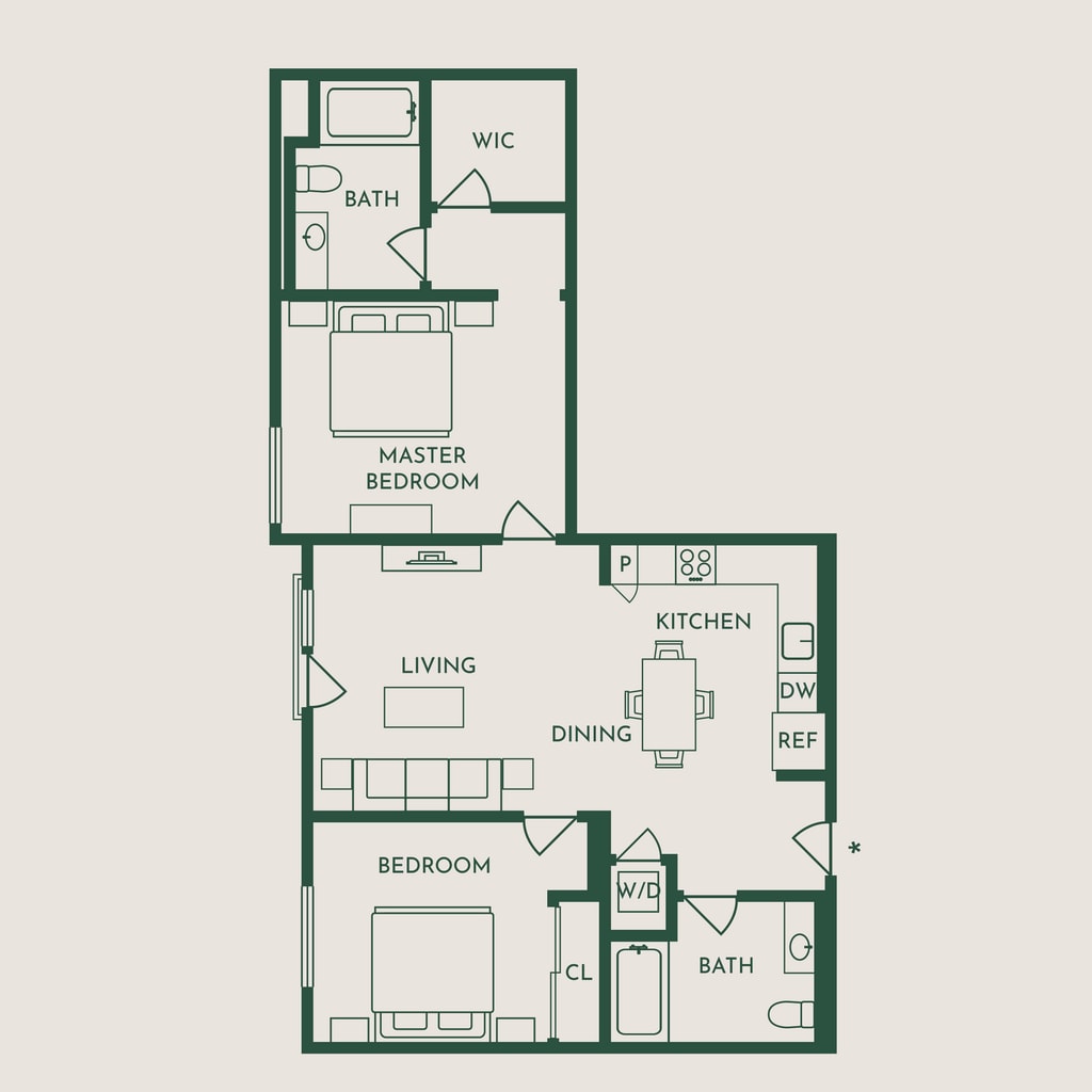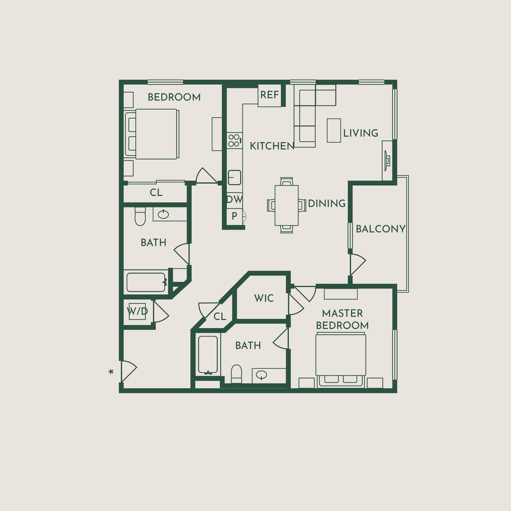 Modelo de apartamento: A1Desde $2,5041 Dormitorio, 1 Baño, 703 sq ftDisponible Ahora![]()