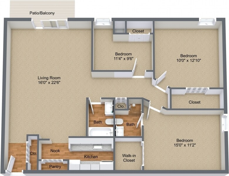 Modelo de apartamento: Three Bedroom$1,3503 Dormitorios, 2 Baños, 1220 sq ftDisponible October 31, 2025Three Bedroom - Plano 1