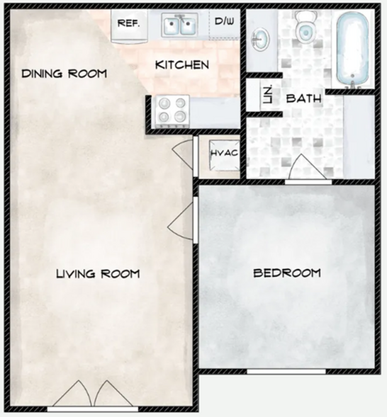 1 Dormitorio, 1 Baño, 550 pies²Disponible AhoraGalería del Modelo