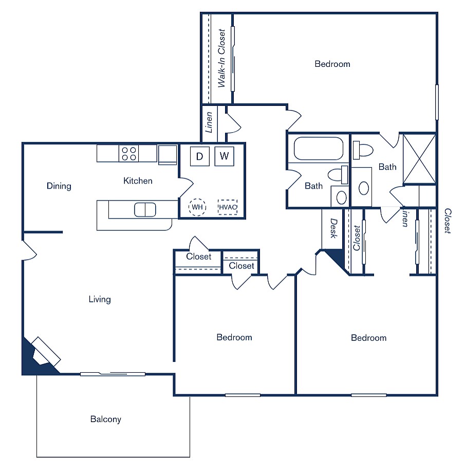 Modelo de apartamento: 3 Bedroom, 2 Bath (1,194 sqft.)Desde $1,9493 Dormitorios, 2 Baños, 1194 sq ftDisponible Ahora![]()
