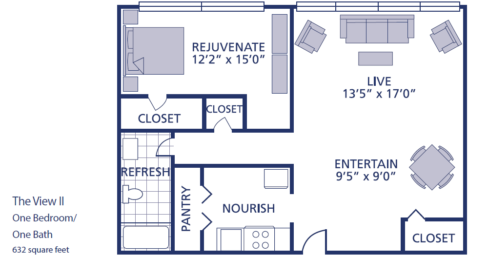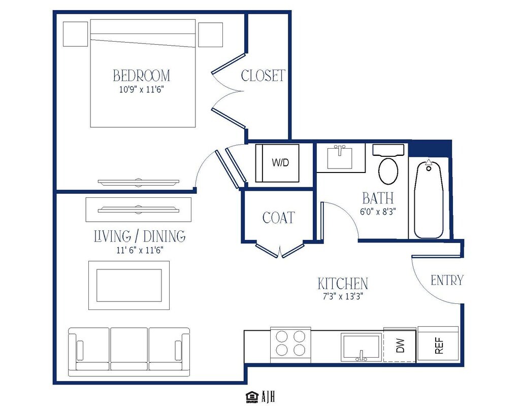 1 Dormitorio, 1 Baño, 632 pies²Disponible AhoraGalería del Modelo