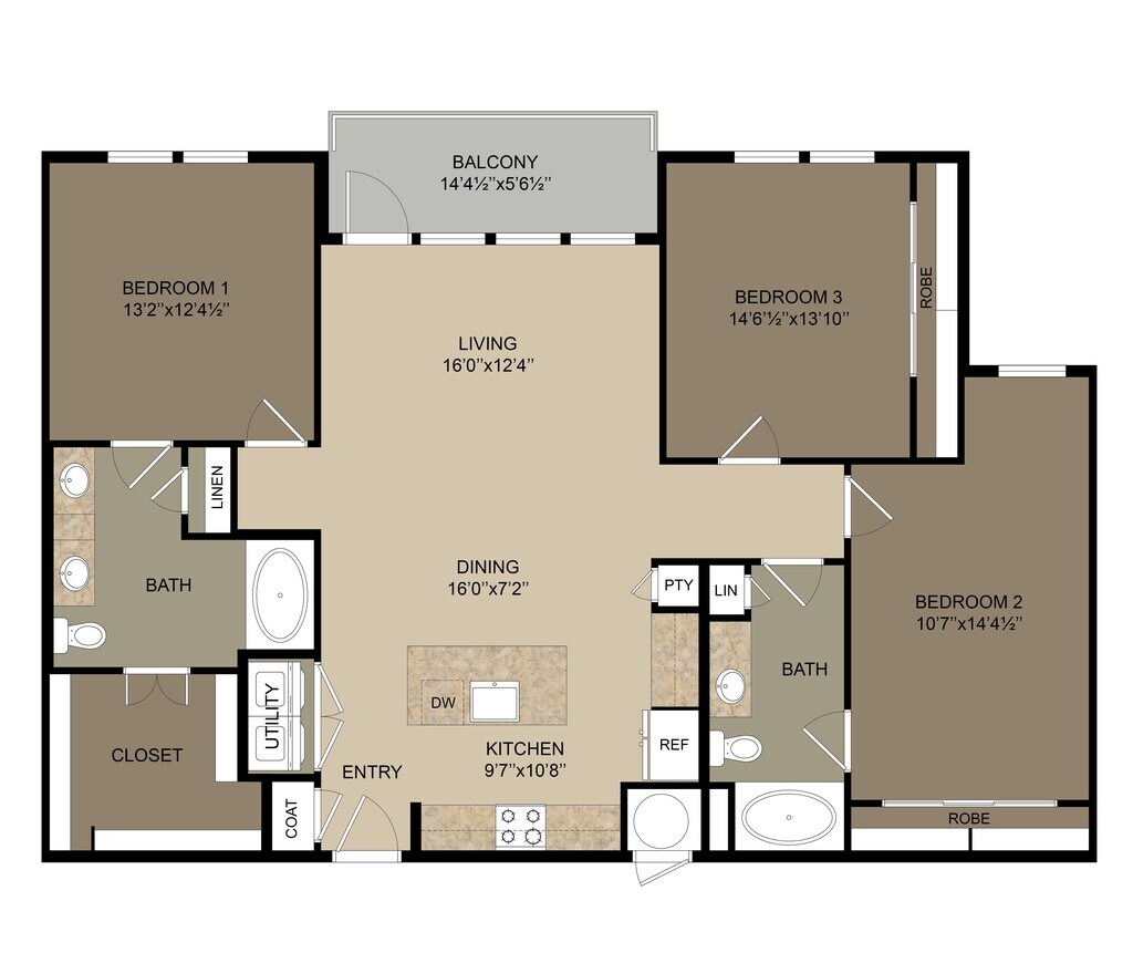 Modelo de apartamento: A4Desde $1,4551 Dormitorio, 1 Baño, 831 sq ftDisponible Ahora![]()