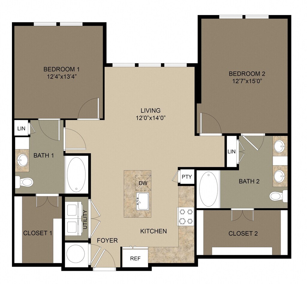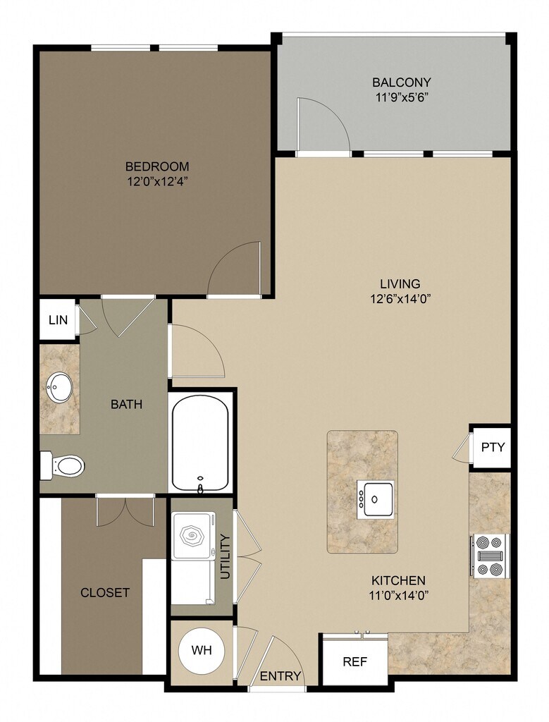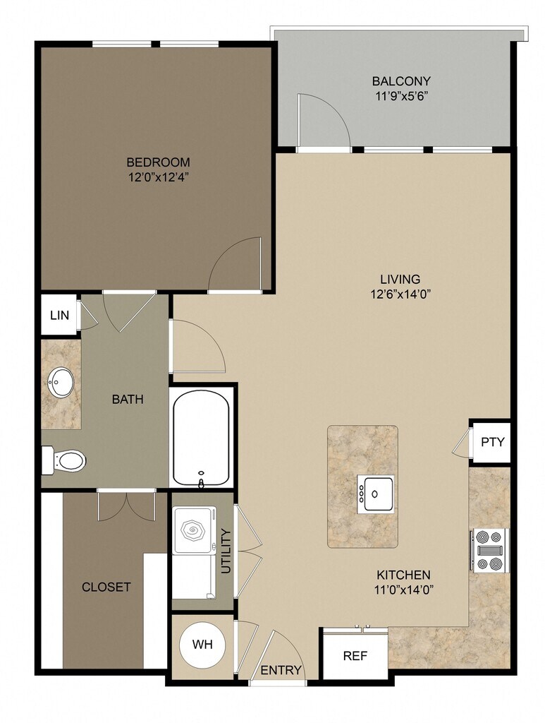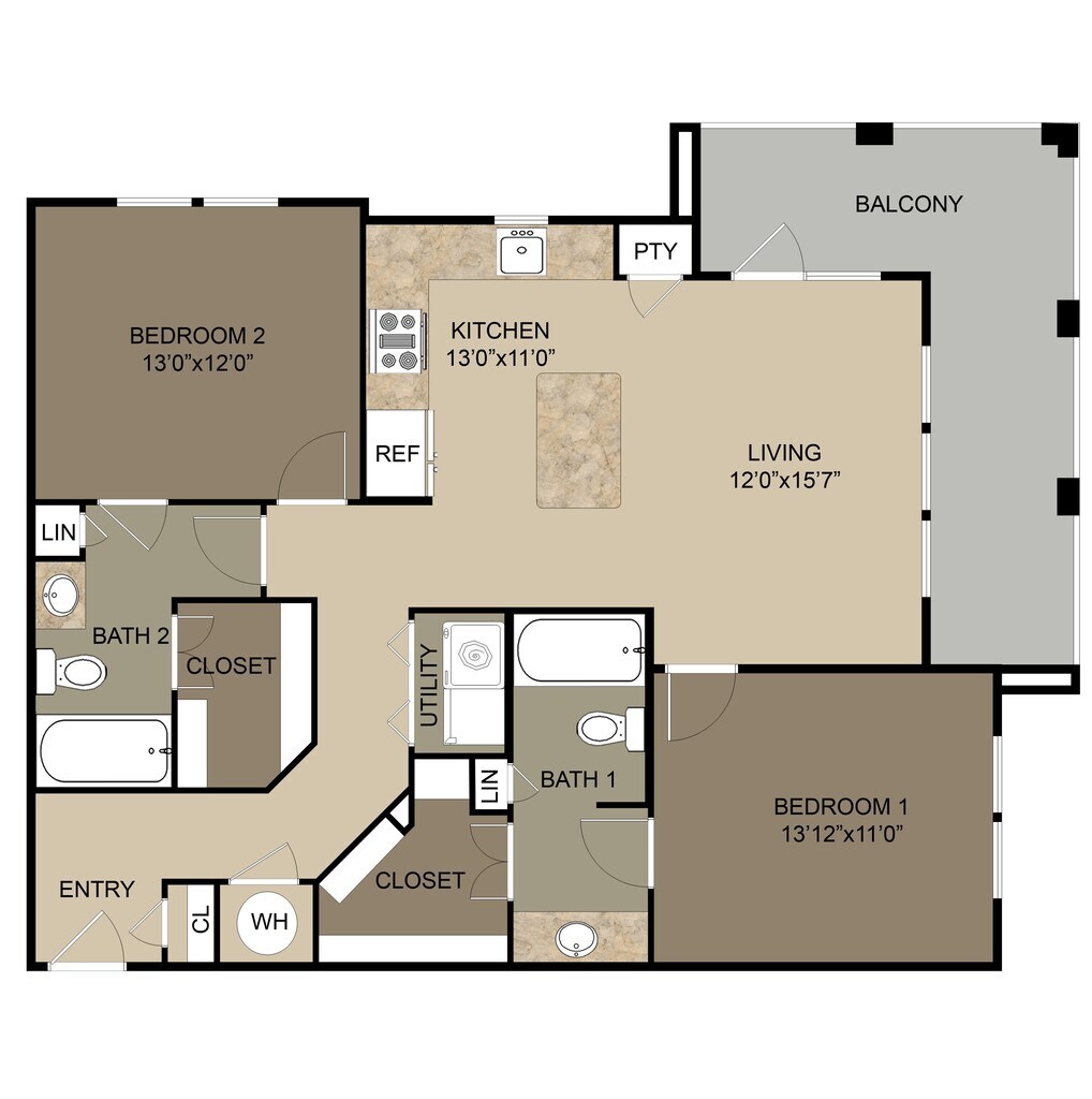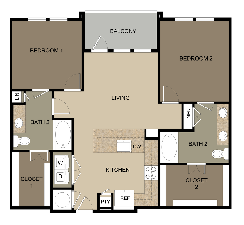 Modelo de apartamento: A2Desde $1,2751 Dormitorio, 1 Baño, 763 sq ftDisponible Ahora![]()