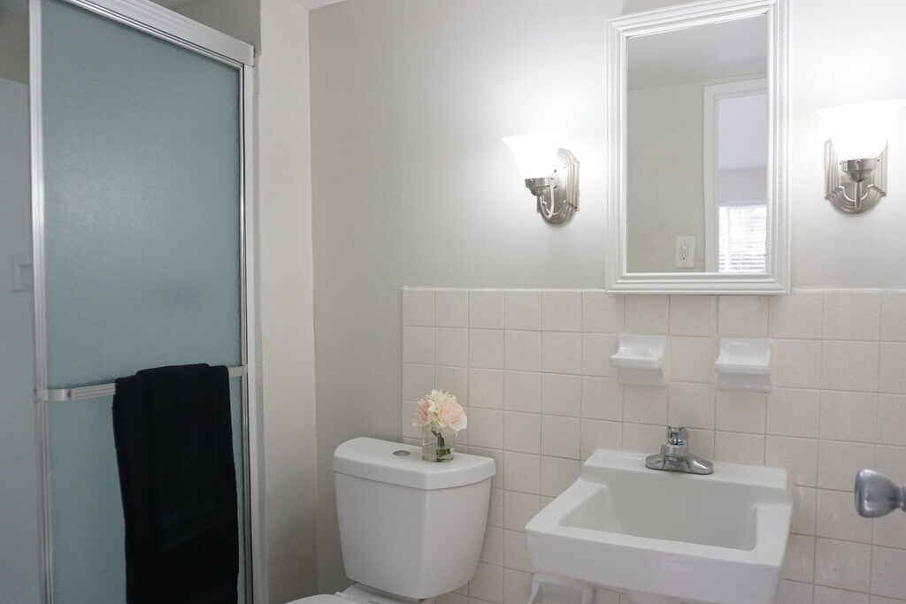 - Baños con azulejos de cerámica con tocadores y almacenamiento
