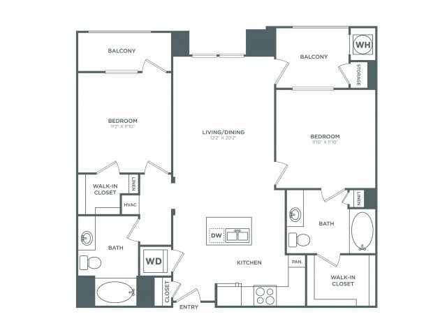 Modelo de apartamento: The Corona Del Mar2 Dormitorios, 2 Baños, 1097 sq ftNo DisponibleLos planos de la planta son una interpretación artística. Todas las dimensiones son aproximadas. Los tamaños o el detalle del producto real y sus especificaciones pueden variar. No todas las características están disponibles en todos los hogares para rentar. Los precios y la disponibilidad están sujetos a cambios. El alquiler que se muestra es mensual. Se pueden aplicar ciertos cargos, por ejemplo, entrega de paquetes, recolección de basura, agua, servicios, etc. Depositos varian. Consulta a un representante para conocer detalles.