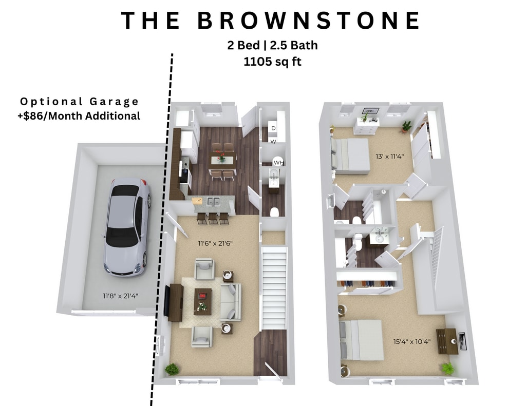 Modelo de apartamento: The Brownstone2 Dormitorios, 2.5 Baños, 1105 sq ftDisponible AhoraLos planos son representaciones artísticas. Todas las dimensiones son aproximadas. El producto y las especificaciones reales pueden variar en tamaño o detalle. No todas las características están disponibles en cada vivienda en alquiler. Por favor, consulta con un representante para obtener más detalles.