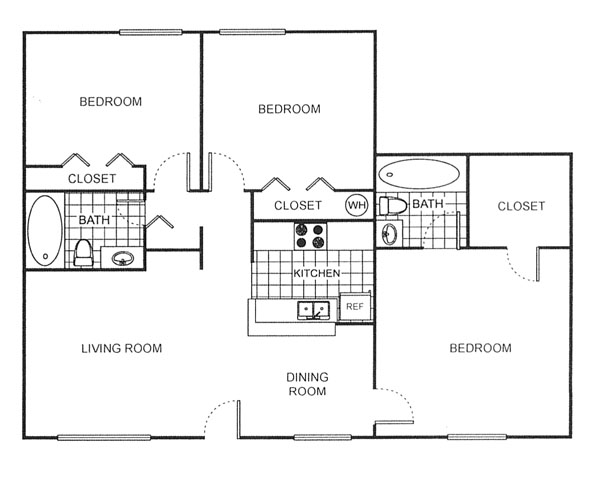 Modelo de apartamento: Three Bedroom3 Dormitorios, 2 Baños, 981 sq ftNo DisponibleThree Bedroom - Plano 1