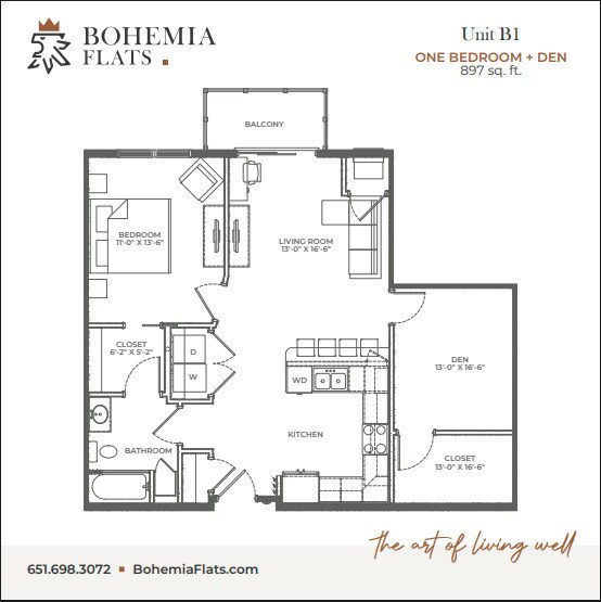 Modelo de apartamento: B1 Style + DenDesde $1,8751 Dormitorio, 1 Baño, 897 sq ftDisponible AhoraB1 Style + Den - Plano 1 2 Dormitorios