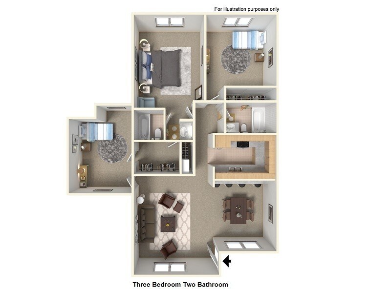 Modelo de apartamento: 3 bed 2 bathDesde $3,3703 Dormitorios, 2 Baños, 1180 sq ftDisponible Ahora![]()