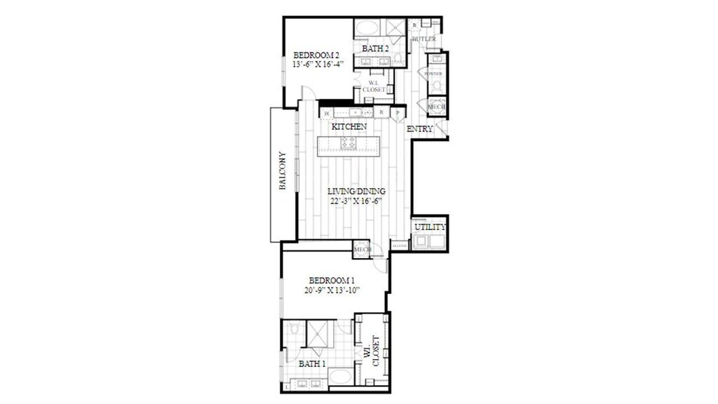T2 - Plano 1 Unidad de apartamento: 1405Modelo de apartamento: T2$4,0581 Dormitorio, 1 Baño, 1070 sq ftDisponible AhoraPlano: T1