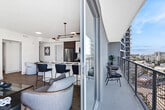 Storied Modern Living An Icon Re-imagined. Choose from a selection of studio to two-bedroom residences, featuring spacious layouts, seemingly endless balconies, providing panoramic views of the city and coast. Each apartment is designed with high-quality finishes, including rich hardwood and matte black accents, creating a sophisticated and welcoming atmosphere. Floor-to-ceiling windows invite natural light, enhancing the open feel of each home.