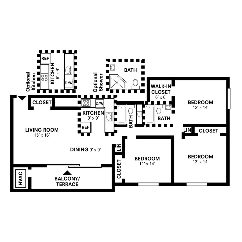 Modelo de apartamento: Three Bedroom$2,3523 Dormitorios, 2 Baños, 1140-1196 sq ftDisponible Ahora![]()