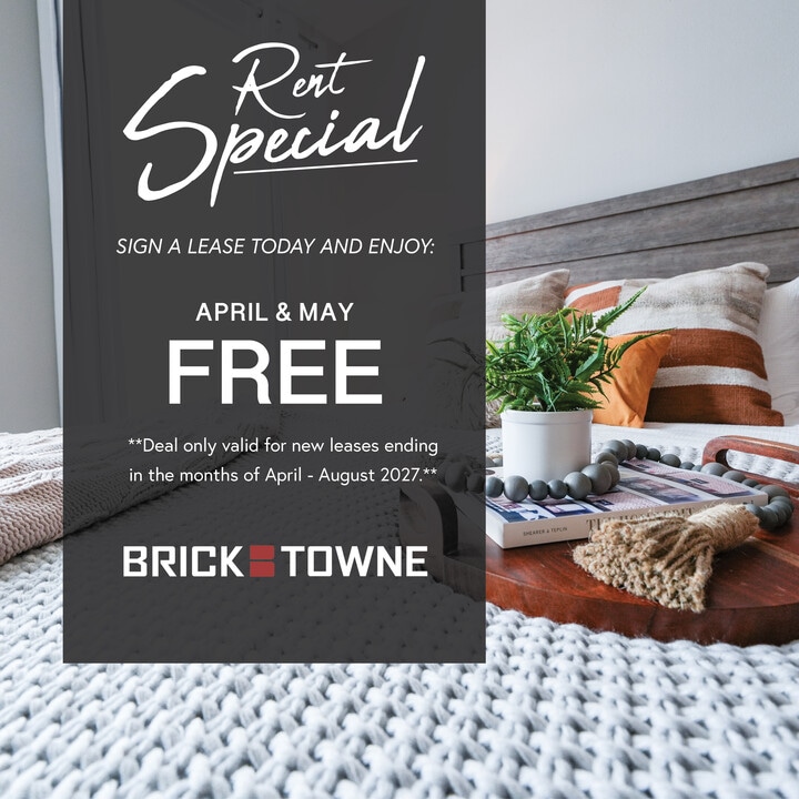La promoción que hay actualmente para la renta en Brick Towne at Prairie Crossing es: NEW SPECIAL - FREE MONTHS~~SIGN A LEASE TODAY & ENJOY: April, and May FREE **Deal only valid for new leases ending in the months of April-Aug of 2027**
