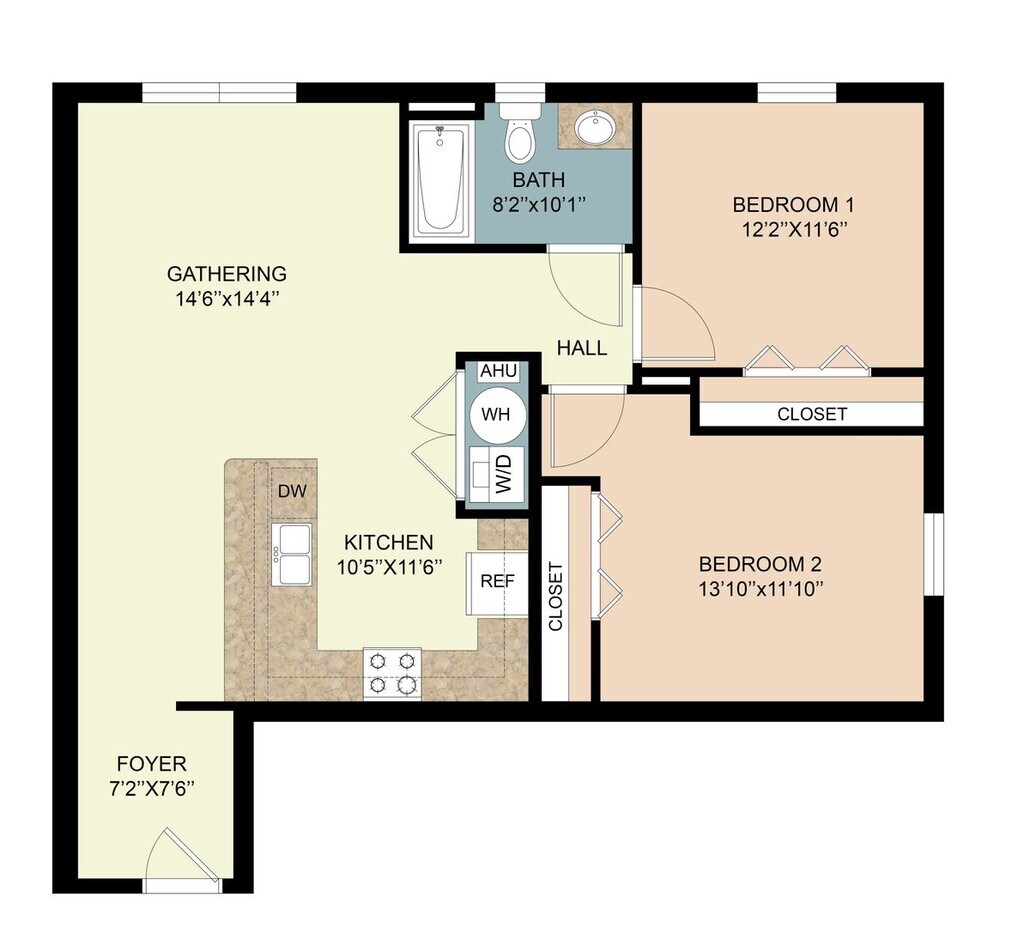 Unidad de apartamento: 1-101Modelo de apartamento: 2BR/1.0BA$1,6202 Dormitorios, 1 Baño, 875 sq ftDisponible Ahora![]()