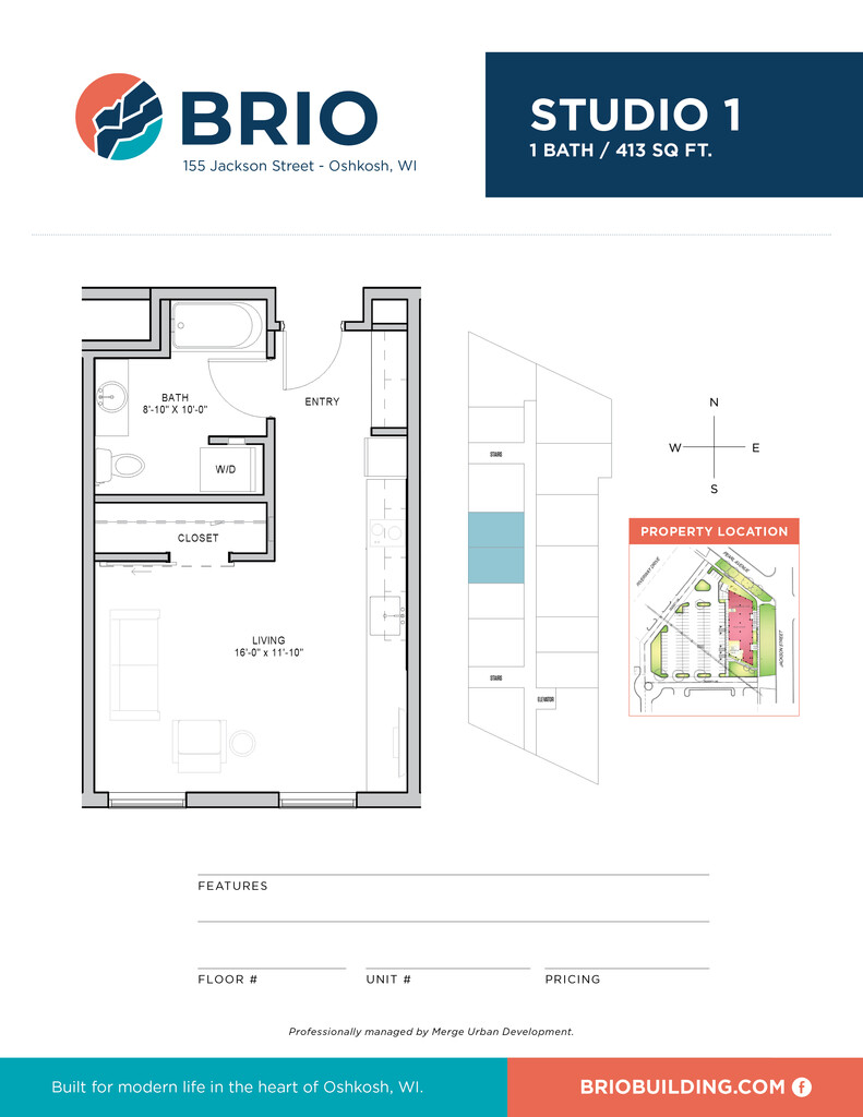 Brio Building se encuentra en el Barrio Downtown Oshkosh y el código postal 54901 de Oshkosh, WI. Esta comunidad está gestionada profesionalmente por Diverge LLC