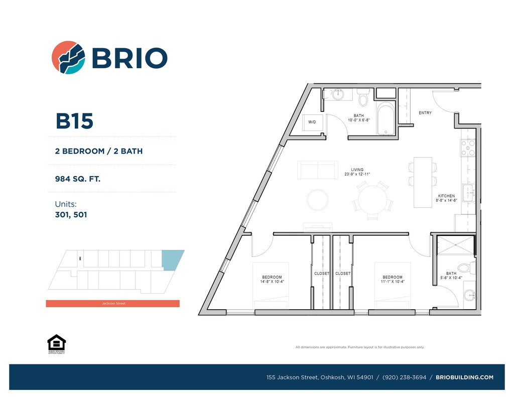 Bienvenido al edificio Brio, ubicado en el vibrante centro de la ciudad de Oshkosh y hogar de la cooperativa de alimentos Oshkosh, propiedad de sus miembros. The Brio Building cuenta con 60 unidades residenciales que van desde estudios hasta 2 habitaciones. El edificio seguro cuenta con un amplio espacio para guardar bicicletas y está a solo unos pasos del sendero recreativo frente al río. El edificio se encuentra a poca distancia a pie de la Universidad de Wisconsin - Oshkosh, el río Fox y las atracciones históricas de Main Street. Todos los apartamentos están equipados con lavadora y secadora, lavaplatos, y apartamentos seleccionados tienen balcones. Muchas de las unidades tienen excelentes vistas del centro de la ciudad, el Fox o ambos. Un número limitado de nuestros estudios también tienen camas Murphy. Consulta acerca de los apartamentos completamente amueblados. Brio admite mascotas.