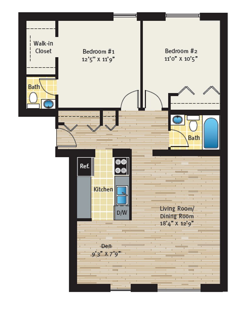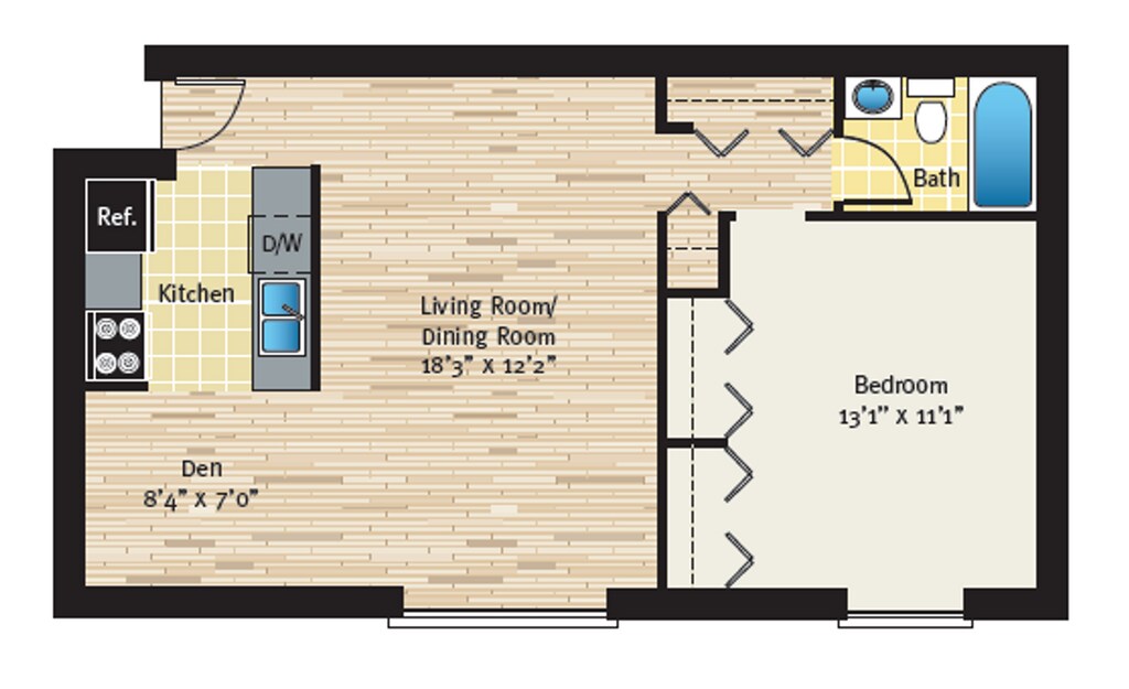 Modelo de apartamento: 1 Bed 1 Bath A1 Dormitorio, 1 Baño, 692 sq ftDisponible AhoraPlanosFotos![]()