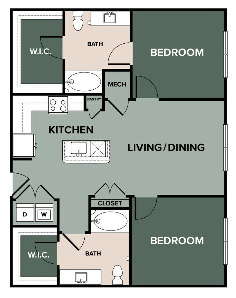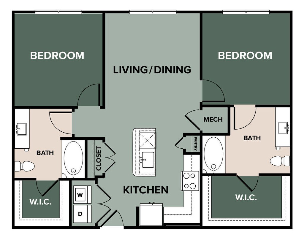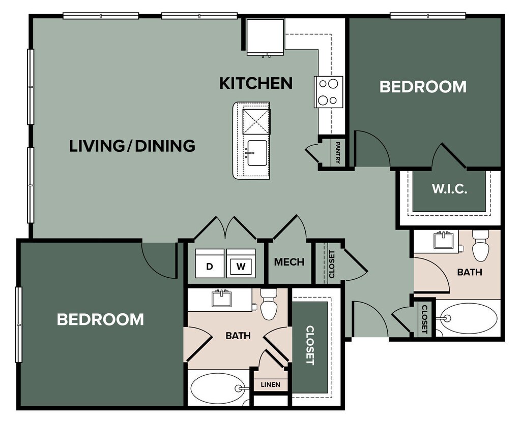 Modelo de apartamento: A2Desde $1,3511 Dormitorio, 1 Baño, 725 sq ftDisponible Ahora![]()