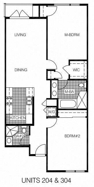 Two-Bedroom Two-Bathroom - A - Plano Unidad de apartamento: 204Modelo de apartamento: Two-Bedroom Two-Bathroom - A2 Dormitorios, 2 Baños, 1100 sq ftDisponible Ahora2 bedroom + 2.5 bath