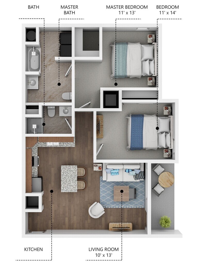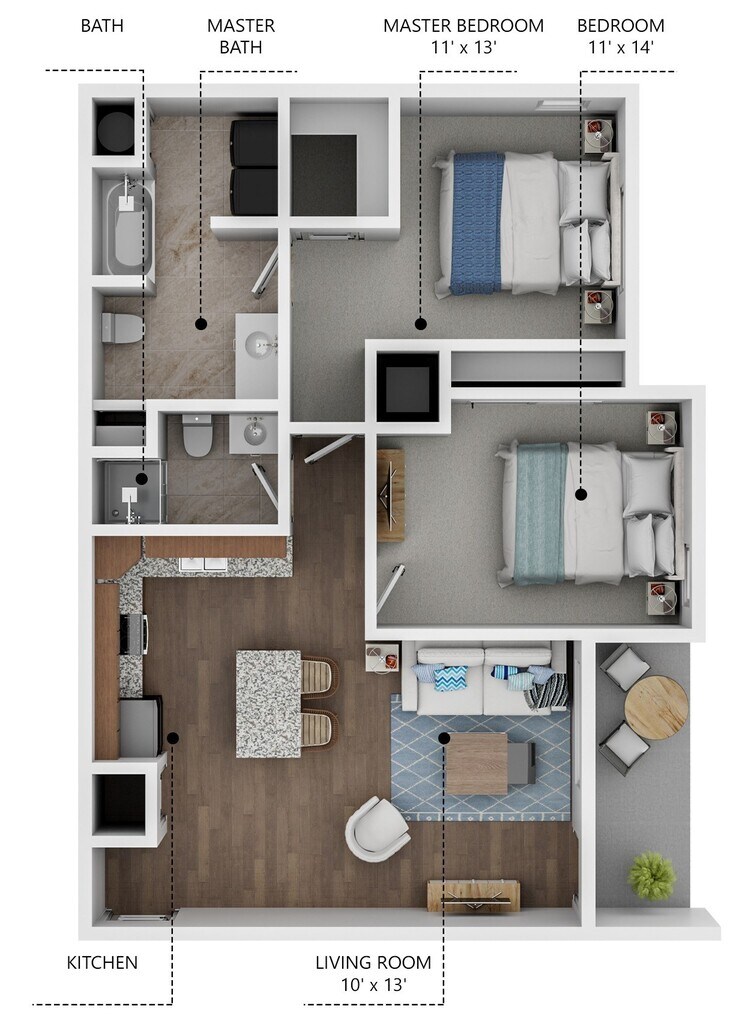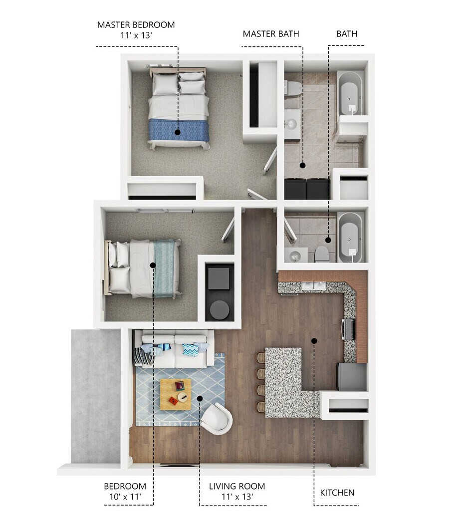 Modelo de apartamento: B2Llame para Precios2 Dormitorios, 2 Baños, 850 sq ftDisponible Ahora![]()