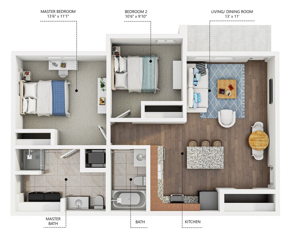 Modelo de apartamento: B1 - 60 - Income Restricted$1,1952 Dormitorios, 2 Baños, 850 sq ftDisponible Ahora![]()
