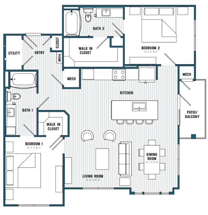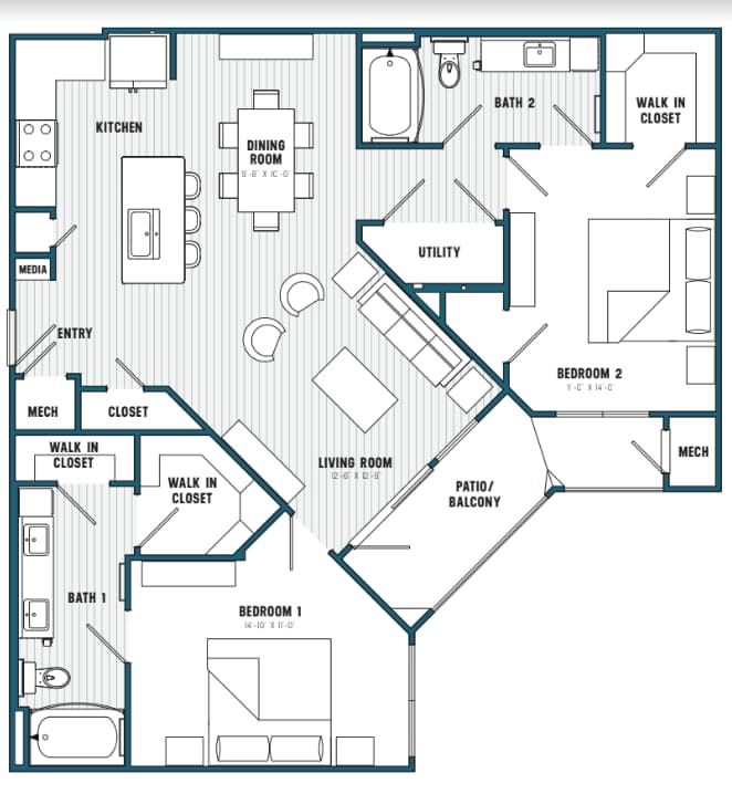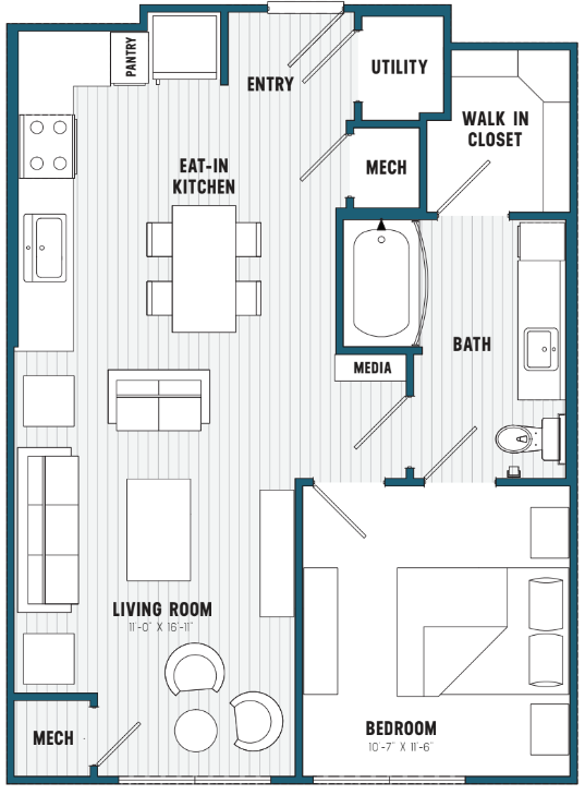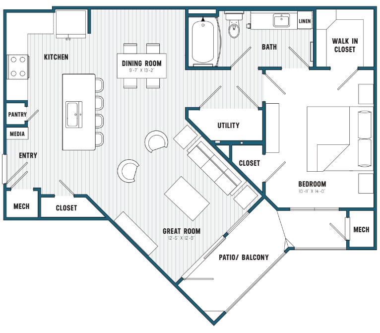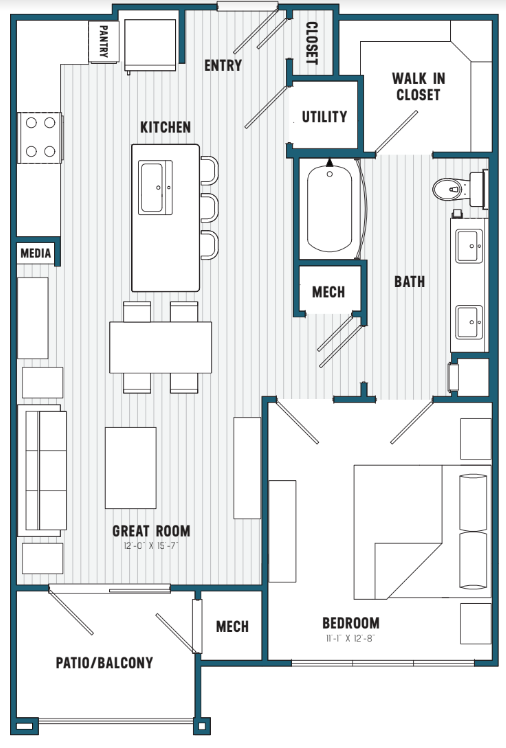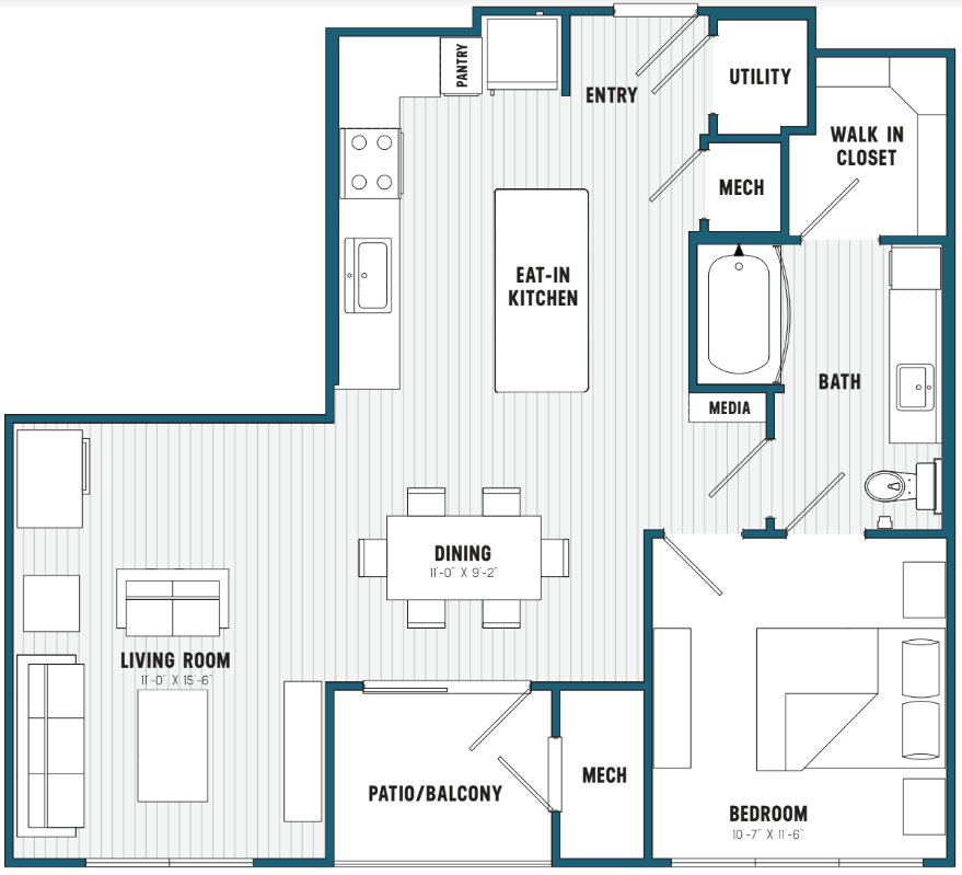 Modelo de apartamento: ADesde $1,6001 Dormitorio, 1 Baño, 686 sq ftDisponible Ahora![]()