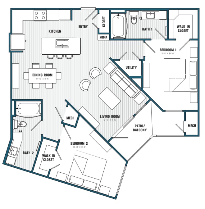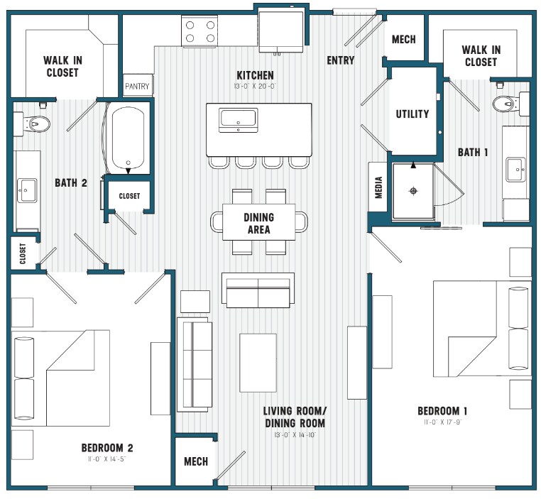 A2 - Plano 1 Unidad de apartamento: 2-2220Modelo de apartamento: A2$1,7301 Dormitorio, 1 Baño, 797 sq ftDisponible December 24, 2025Plano: A1
