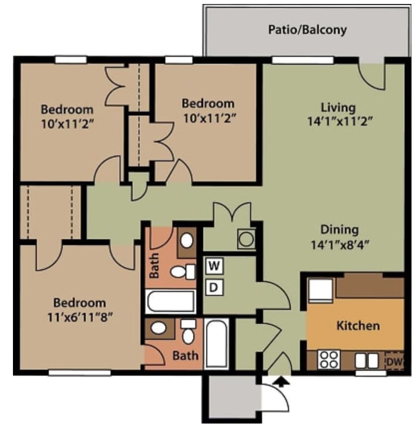 Modelo de apartamento: 2X1$1,3342 Dormitorios, 1 Baño, 938 sq ftDisponible Ahora![]()