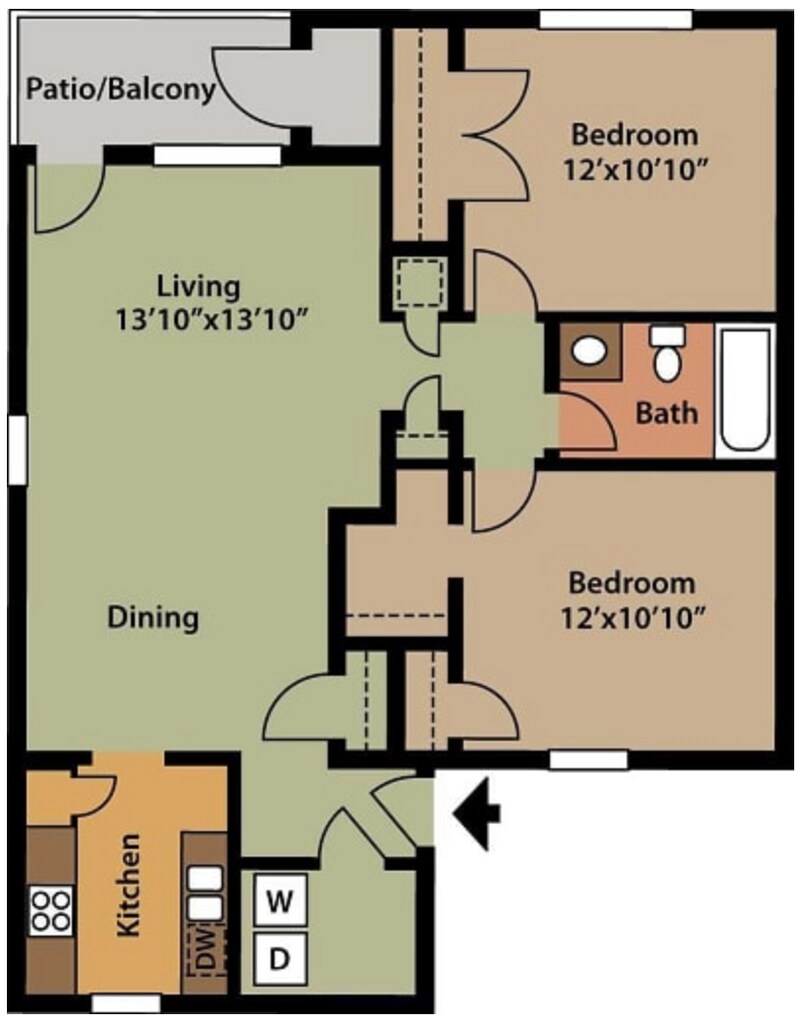 Modelo de apartamento: 2X2Desde $1,3082 Dormitorios, 2 Baños, 1043-1163 sq ftDisponible Ahora![]()