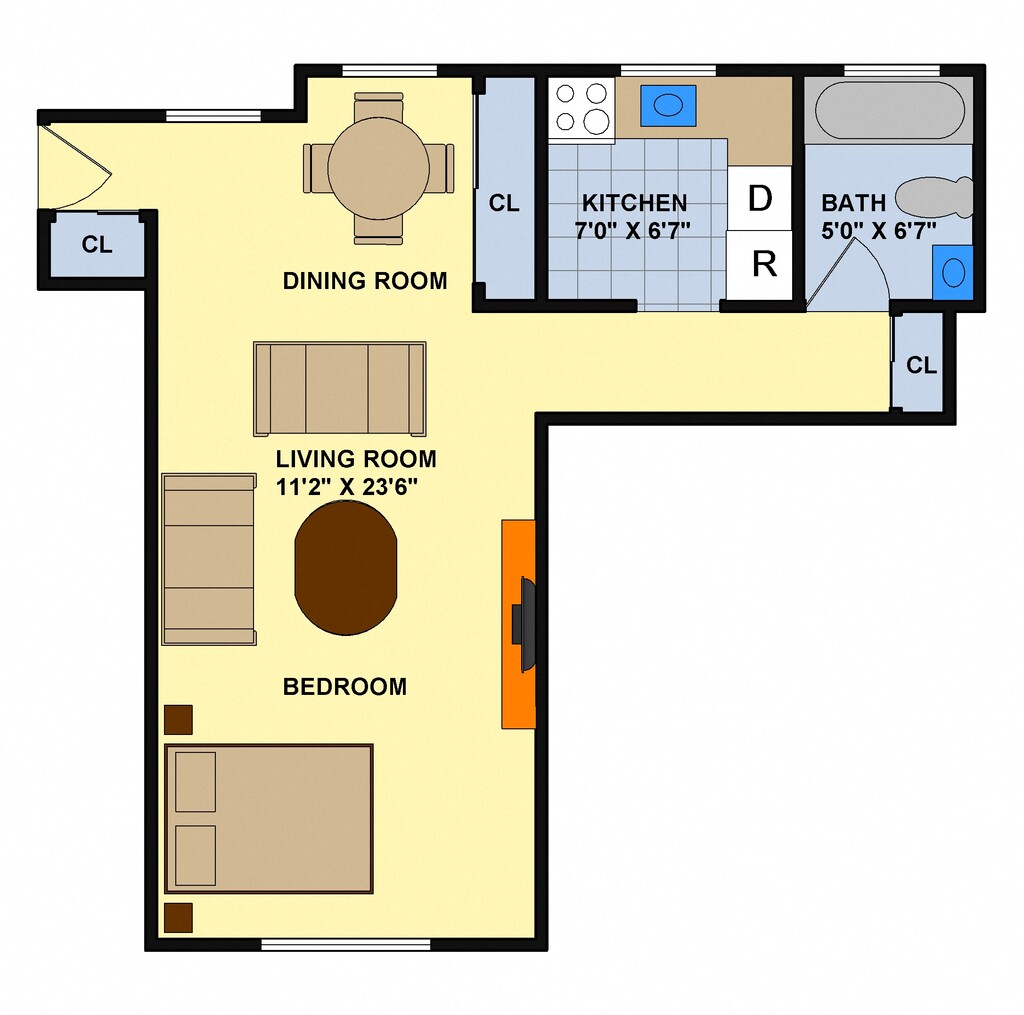 Studio (Downstairs) - Plano 1 Unidad de apartamento: 17BModelo de apartamento: Studio (Downstairs)$1,896Estudio, 1 Baño, 400 sq ftDisponible November 30, 20251 Dormitorio