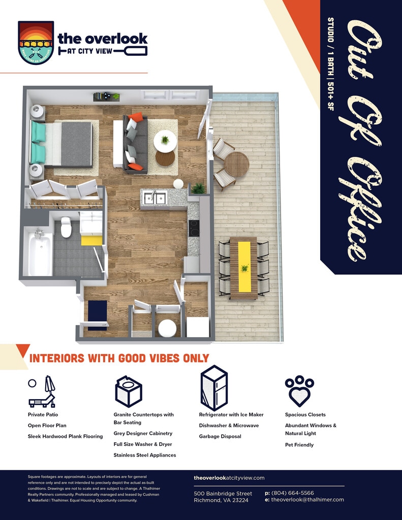 Out Of Office - Plano 1 Unidad de apartamento: D2507Modelo de apartamento: Out Of OfficeEstudio, 1 Baño, 501 sq ftDisponible November 7, 20251 Dormitorio