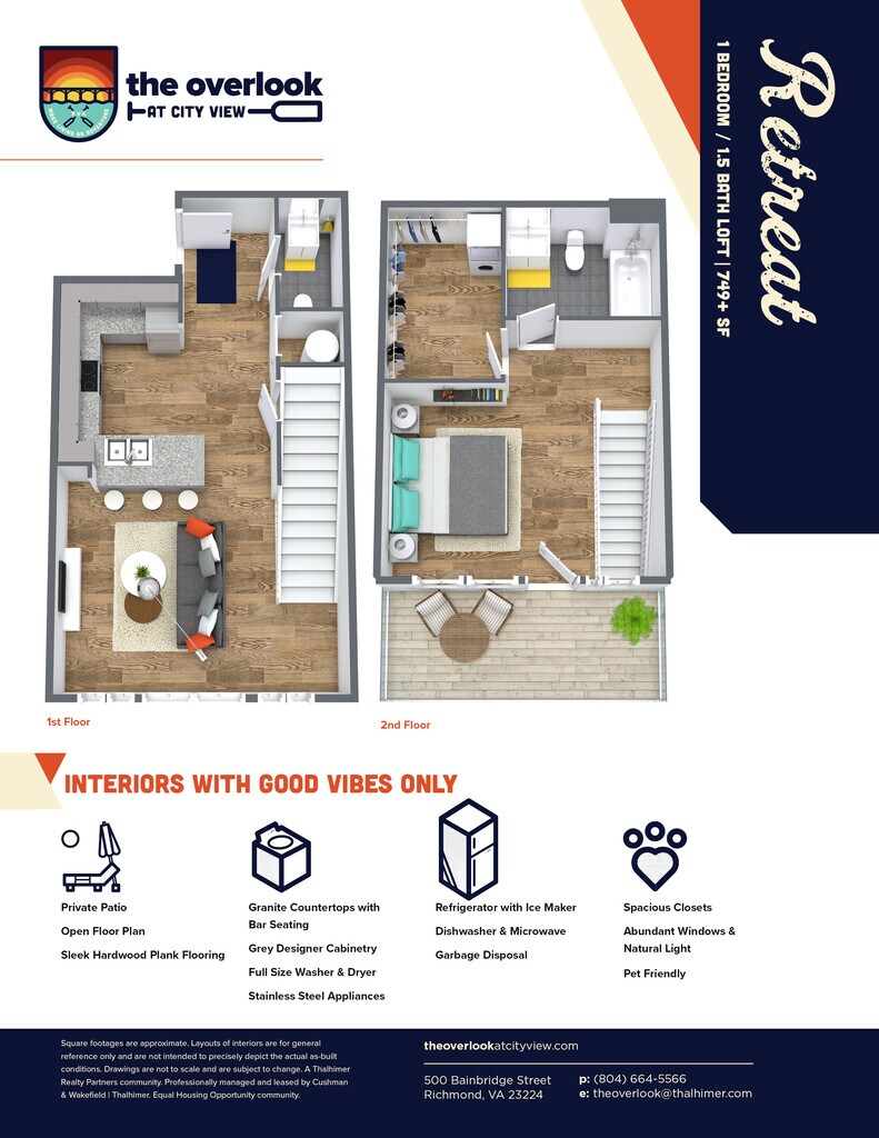 Modelo de apartamento: Retreat1 Dormitorio, 1.5 Baños, 741-893 sq ftDisponible Ahora![]()