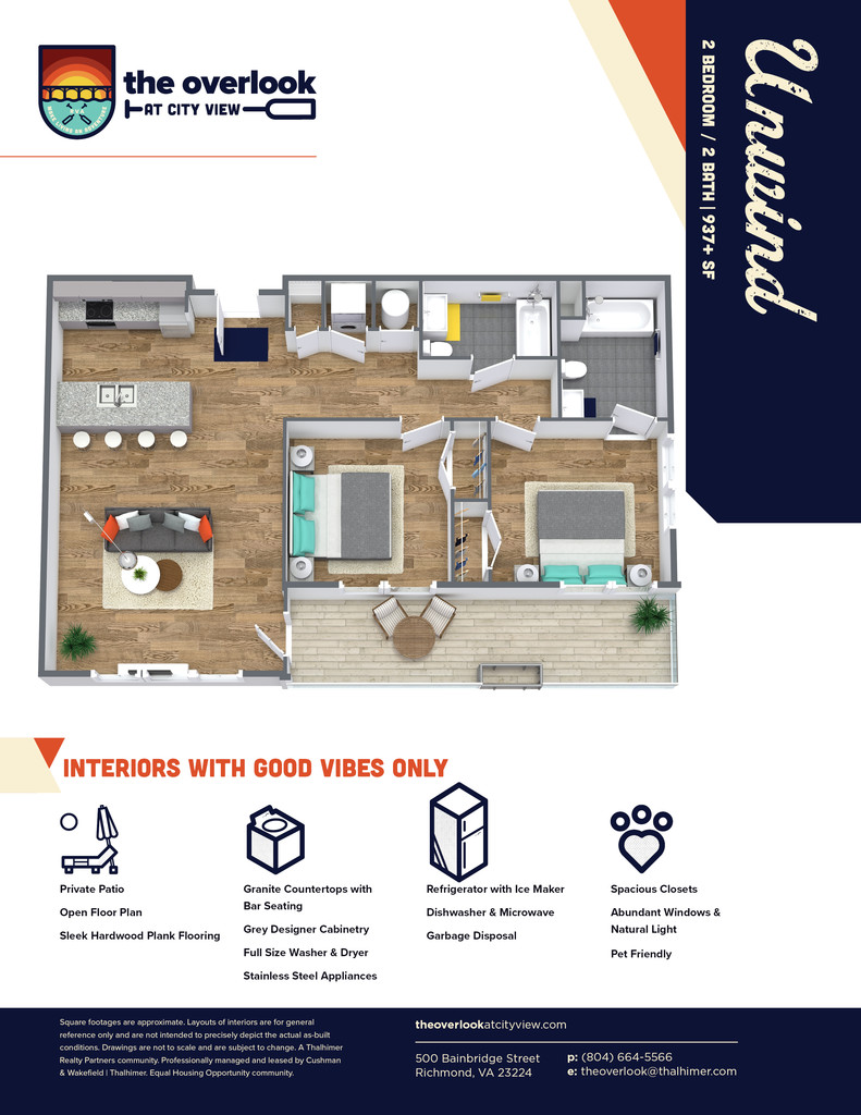 Modelo de apartamento: Unwind2 Dormitorios, 2 Baños, 894-937 sq ftDisponible Ahora![]()