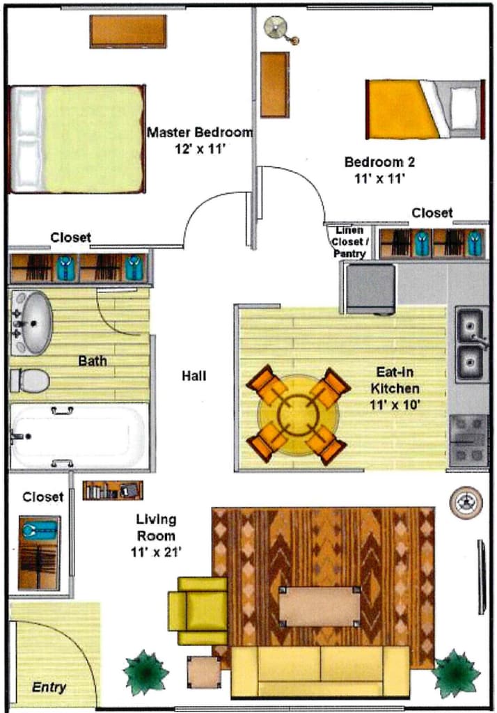 Unidad de apartamento: 13161-3Modelo de apartamento: 2BR/1.0BA$1,0252 Dormitorios, 1 Baño, 800 sq ftDisponible Ahora![]()