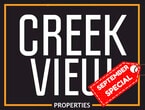 La promoción que hay actualmente para la renta en ***CREEKVIEW PROPERTIES*** es: >>>SPECIALS<<<< 50% OFF SECURITY DEPOSIT~~******OCTOBER'S SPECIAL ****50% OFF SECURITY DEPOSIT REQUIRED AT SIGNING**** (Some restrictions apply).