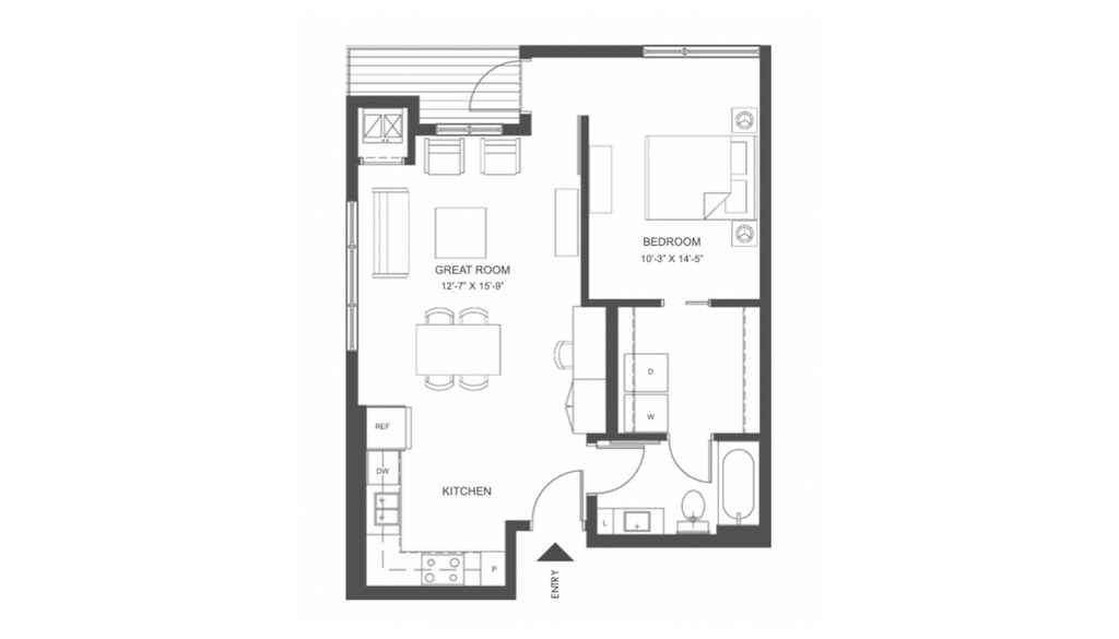 E1 - Plano 1 Unidad de apartamento: 501Modelo de apartamento: E1$1,8151 Dormitorio, 1 Baño, 686 sq ftDisponible April 1, 2026![]()